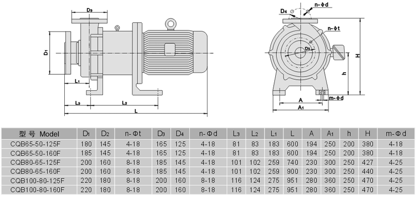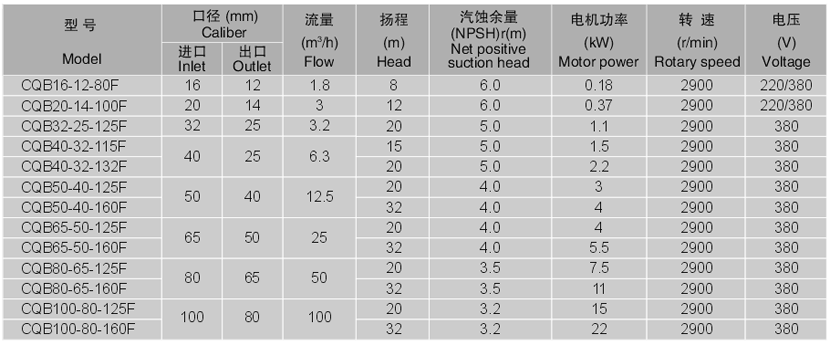 四、CQB-F襯氟磁力泵性能參數(shù):